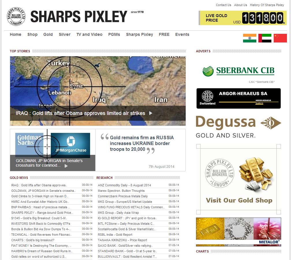 Sharps Pixley Ltd are a large London based bullion broker tracing their foundation to 1778. Now part of Degussa Goldhandel (Gold Trade) Group, they are expanding rapidly internationally. As well as general precious metals brokerage and investment services, Sharps Pixley provide in-depth market analysis on site and sell physical gold and silver bullion through a well-stocked e-commerce facility.