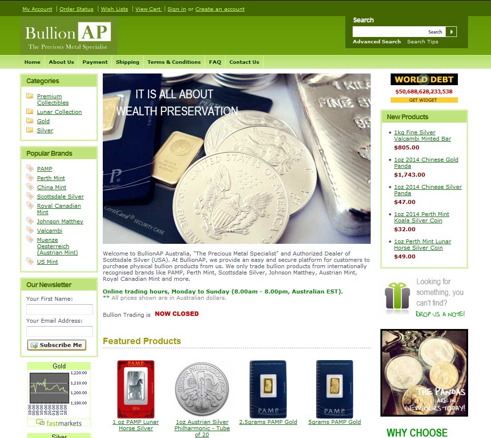 BullionAP Trading are a national bullion dealer, trading through a well stocked e-commerce site and selling big-name international and premium brands, some of which are relatively rare in Australia – such as the excellent Scottsdale Silver range of bars.