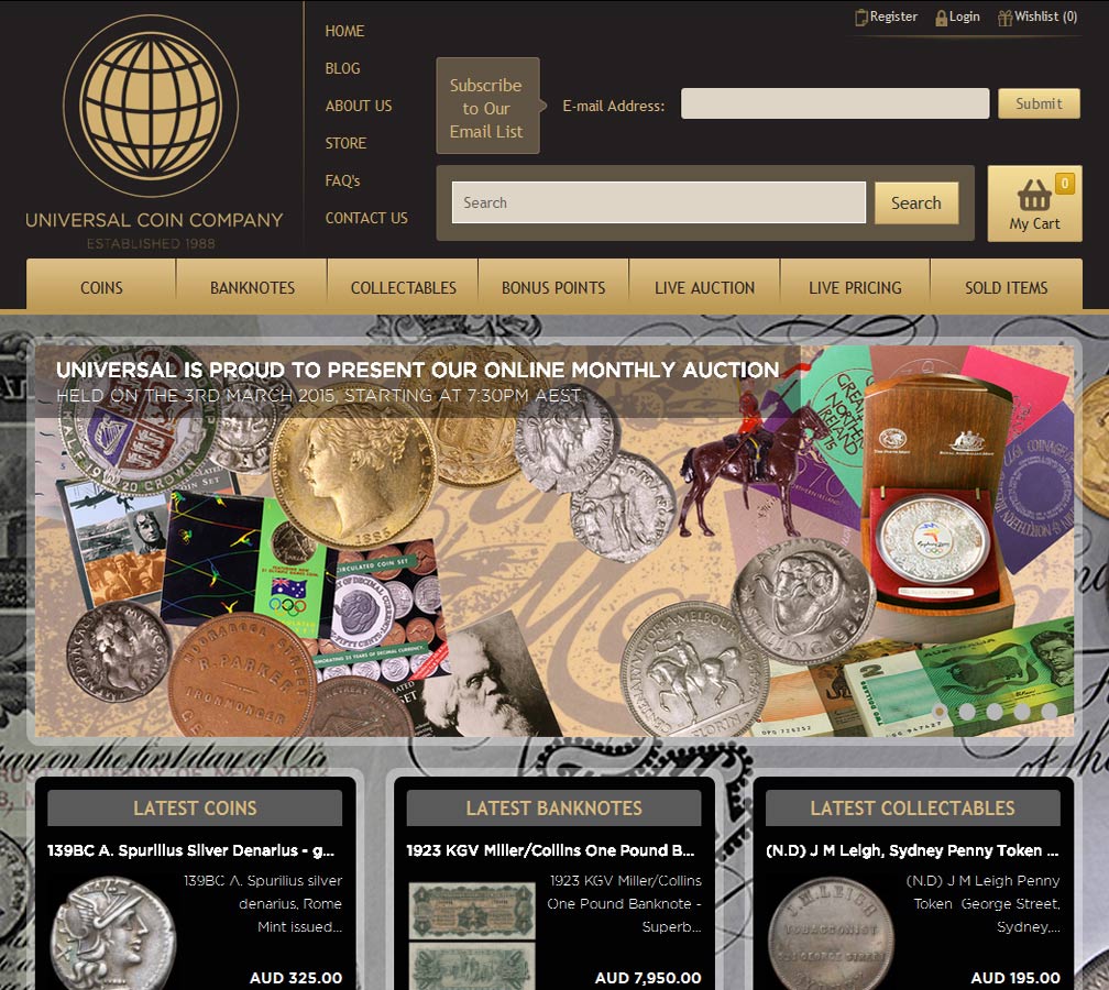 Universal Coin Company are a long established numismatic dealer, operating a retail store in Melbourne and a well-stocked e-commerce website selling an excellent range of rare and collectible currency including precious metal coins, alongside jewellery, medallions, medals ad other collectibles.