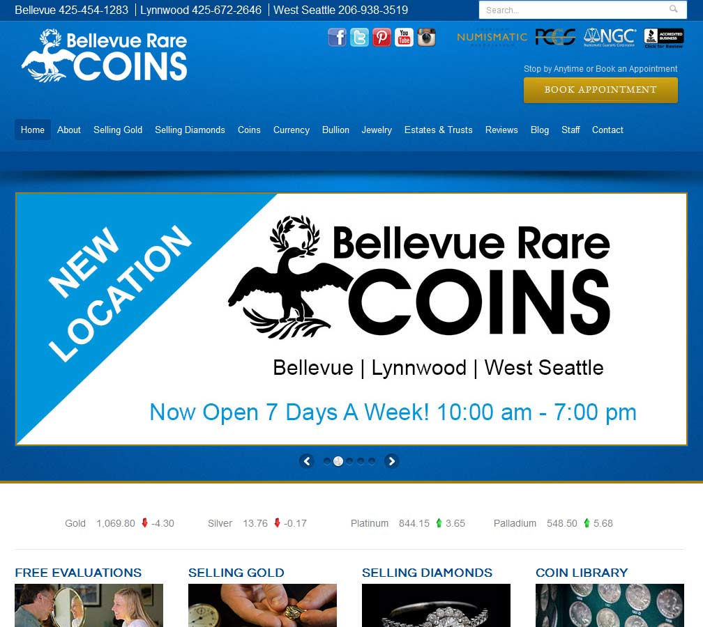 Bellevue Rare Coins is a newly (2010) rebranded iteration of a long-established and respected family-owned coin dealer, based in three Washington locations – Bellevue, Lynnwood and Seattle. They buy and sell numismatics, bullion coins and bars and offer cash for scrap and unwanted jewelry, watches and flatware, from their busy retail outlets
