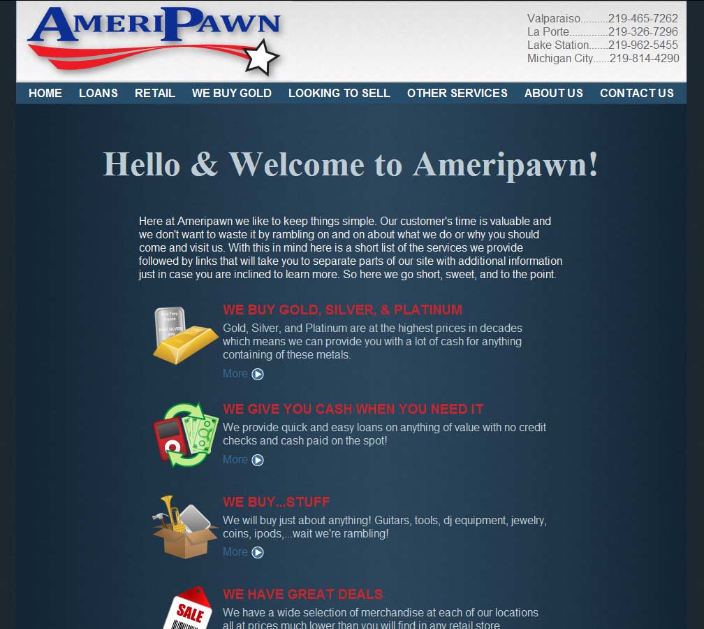 Ameripawn are a multi-city pawnshop specializing in precious metals. With retail presences in Valparaiso, La Porte, Lake Station and Michigan City, Ameripawn buys and sells bullion bars, coins, numismatics and scrap jewelry – as well as other items of value.