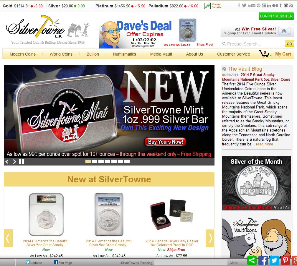 SilverTowne is a large family-run precious metals dealer selling locally from a unique retail “village” in Winchester, Indiana and nationally through an e-commerce website. SilverTowne buys and sells bullion bars, coins, numismatics and collectibles as well as selected jewelry.