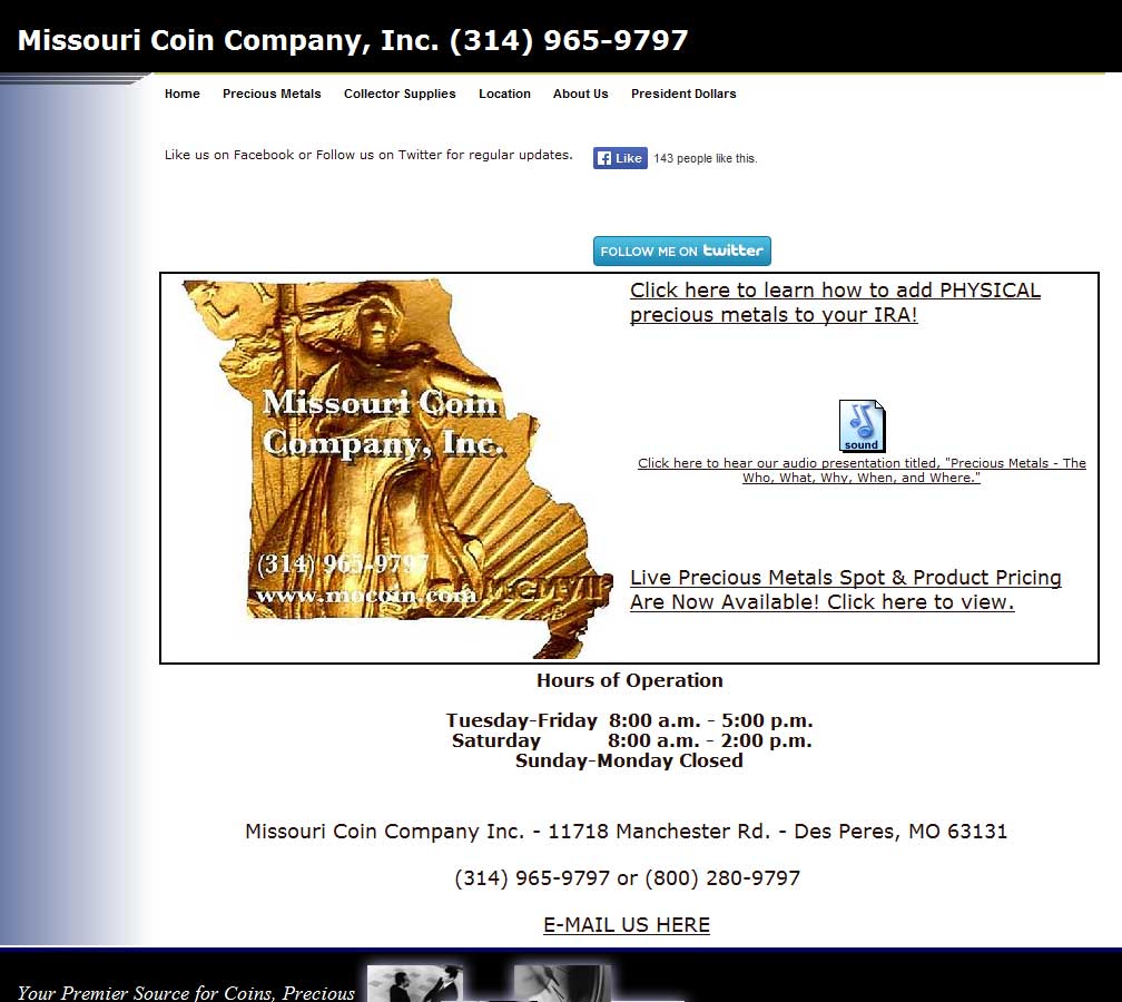 Missouri Coin Company are a numismatic and rare coin dealer with a retail base in Des Peres, Missouri from which they also buy and sell precious metals and help arrange metals-backed retirement plans.