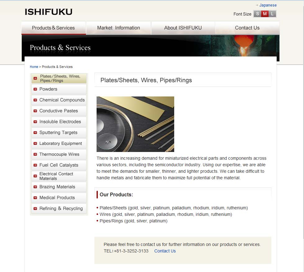 Products are – Plates/Sheets (gold, silver, platinum, palladium, rhodium, iridium, ruthenium), Wires (gold, silver, platinum, palladium, rhodium, iridium, ruthenium) and Pipes/Rings (gold, silver, platinum)
