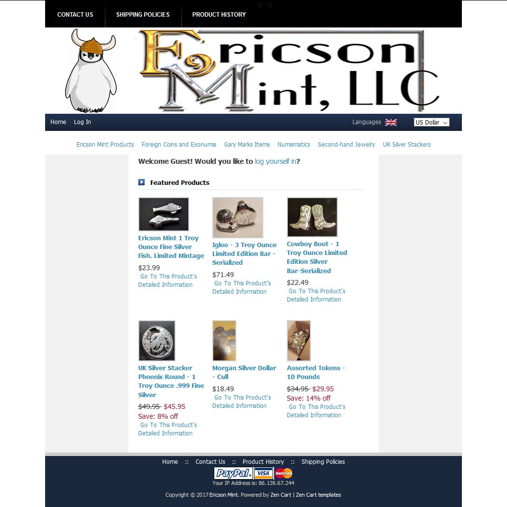 Ericson Mint specializes in uniquely poured fine silver bars, as well as retailing of 3rd party products and some numismatics.