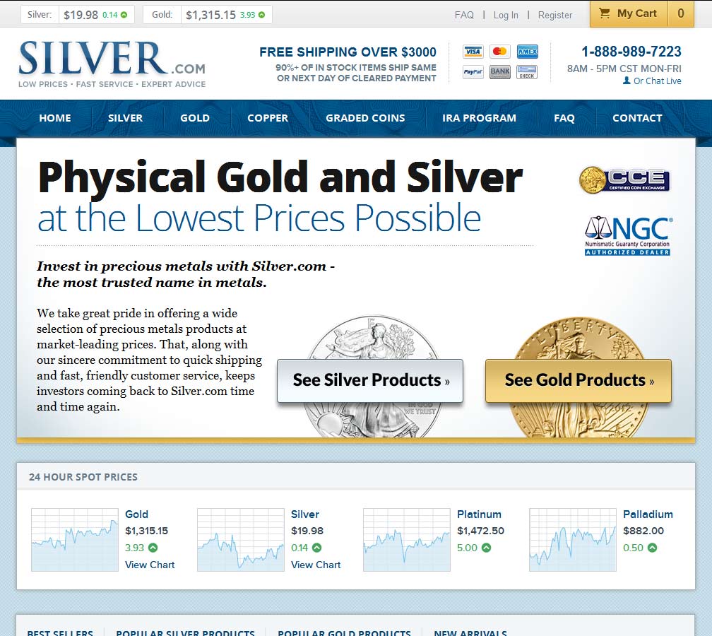 Silver.com are a relatively new but rapidly expanding precious metals company operating nationally out of Dallas, Texas. Despite their name they do sell all precious metals, carrying bullion bar and coins, numismatics and collectibles inside their well-stocked e-commerce store. As well as retail sales, Silver.com help organize precious metals backed retirement products.