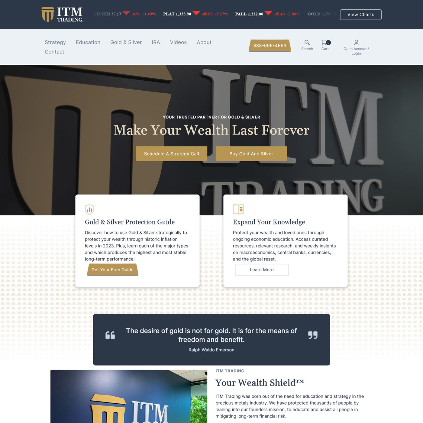 The ITM Trading website is a wealth of information covering general precious metals investing as well as precious metals backed investment accounts. Detail is extensive on individual products within the e-commerce element of the site with images being of good quality. ITM also provide a free gold investment kit through a lead form on the homepage