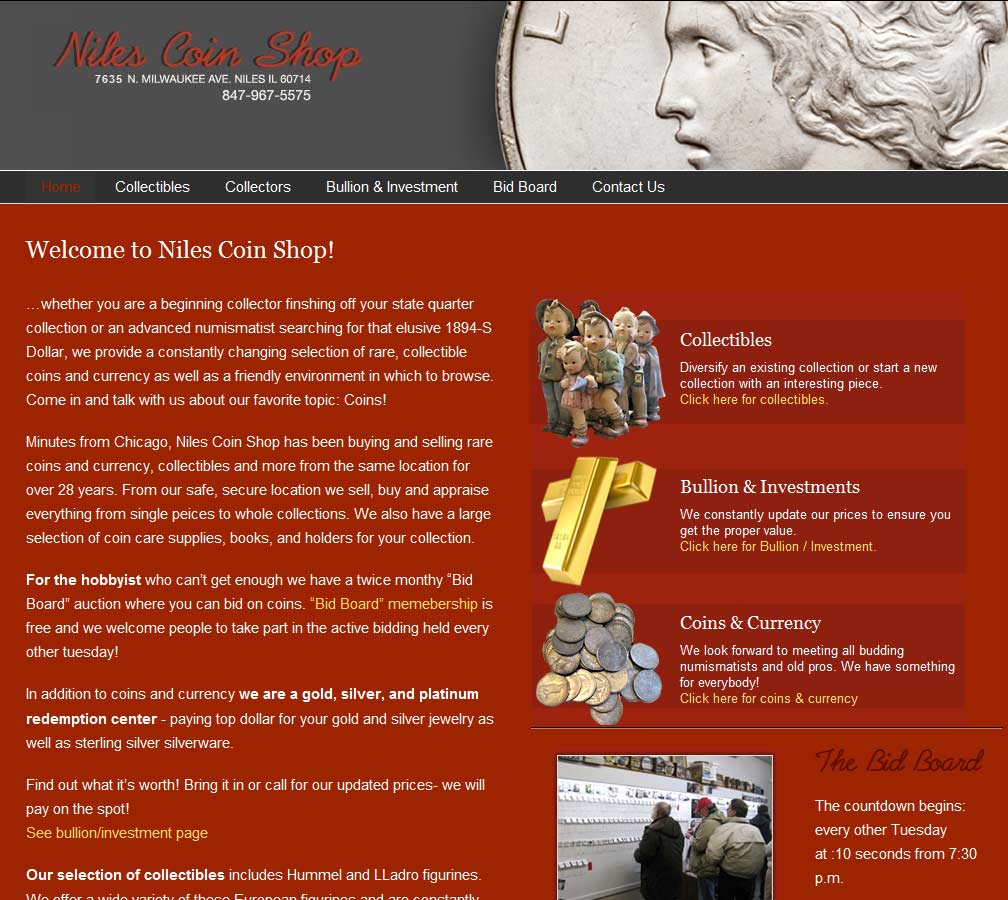 Niles Coin Shop buy and sell bullion bars, coins, numismatics and collectibles from a retail store in Niles, Illinois. As well as selling products the traditional way, they have an unusual bid-board system selling in an auction-style weekly.