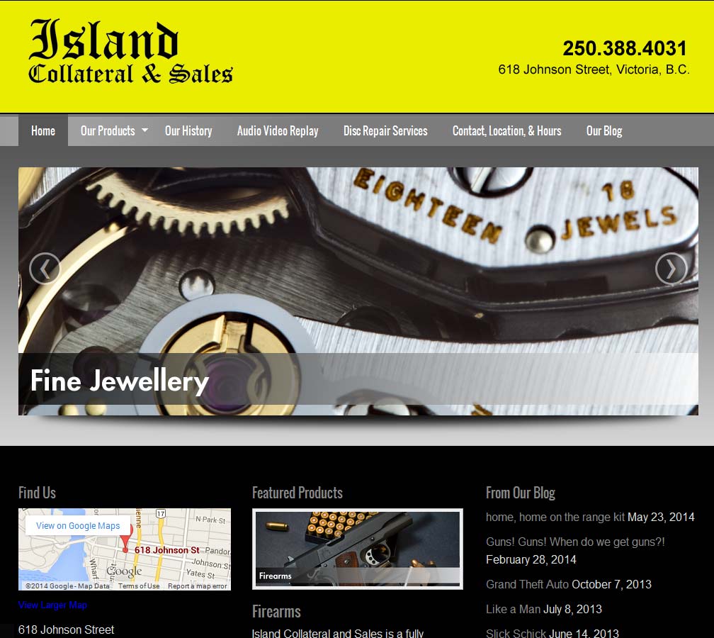 Island Collateral and Sales is a pawn shop with a main store in Victoria and a satellite store in Charlottetown, PEI. They deal in bullion, coins and scrap jewelry among other valuables.
