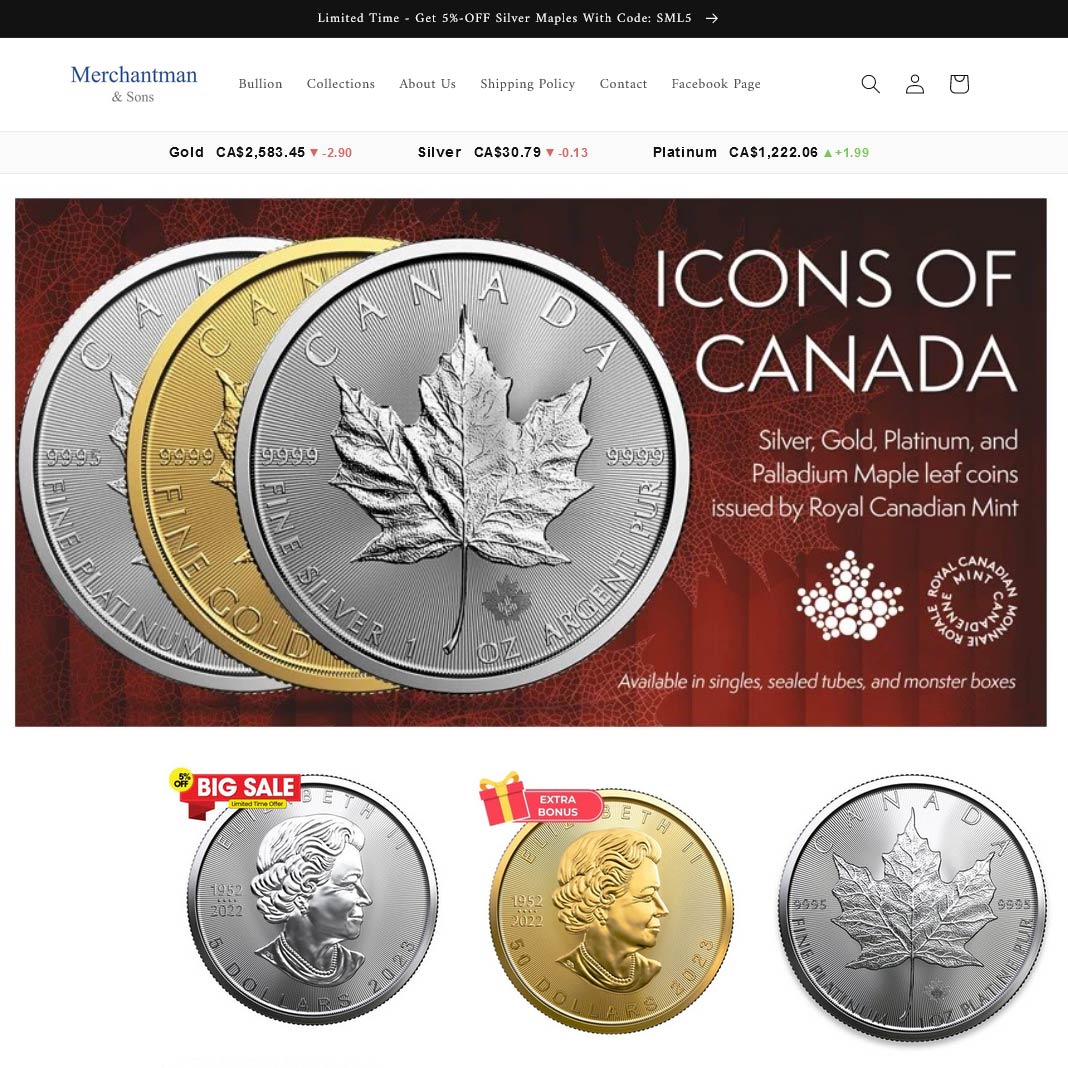 Merchantman & Sons Trading Co. is a Canadian bullion dealer located in Vancouver, British Columbia, specializing in the distribution of bullion products sourced from the Royal Canadian Mint. Our company is recognized for providing competitively priced options within the industry, accompanied by efficient and secure delivery services for both Canadian and US customers.