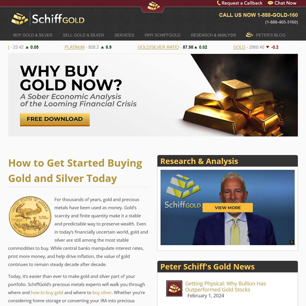 As we’d expect from Peter Schiff, the SchiffGold site contains a significant amount of useful and easy to follow general, product and investment information as well as additional publications available for free download. Despite not being an e-commerce site, individual product descriptions are detailed with crisp sharp images, and useful video content. All legal, information and contact information is present.