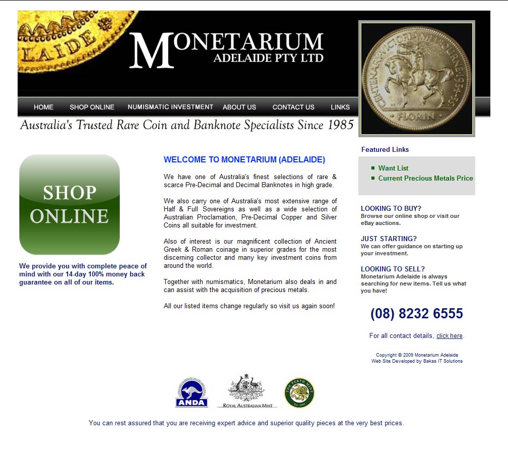 Monetarium Adelaide are long established and well respected numismatic specialists dealing in rare, collectible and ancient coins, both base and precious metal. As a indicator of the levels of expertise Monetarium offer, senior director Steven Nugent is currently serving his fourth term as President of the Australasian Numismatic Dealers Association
