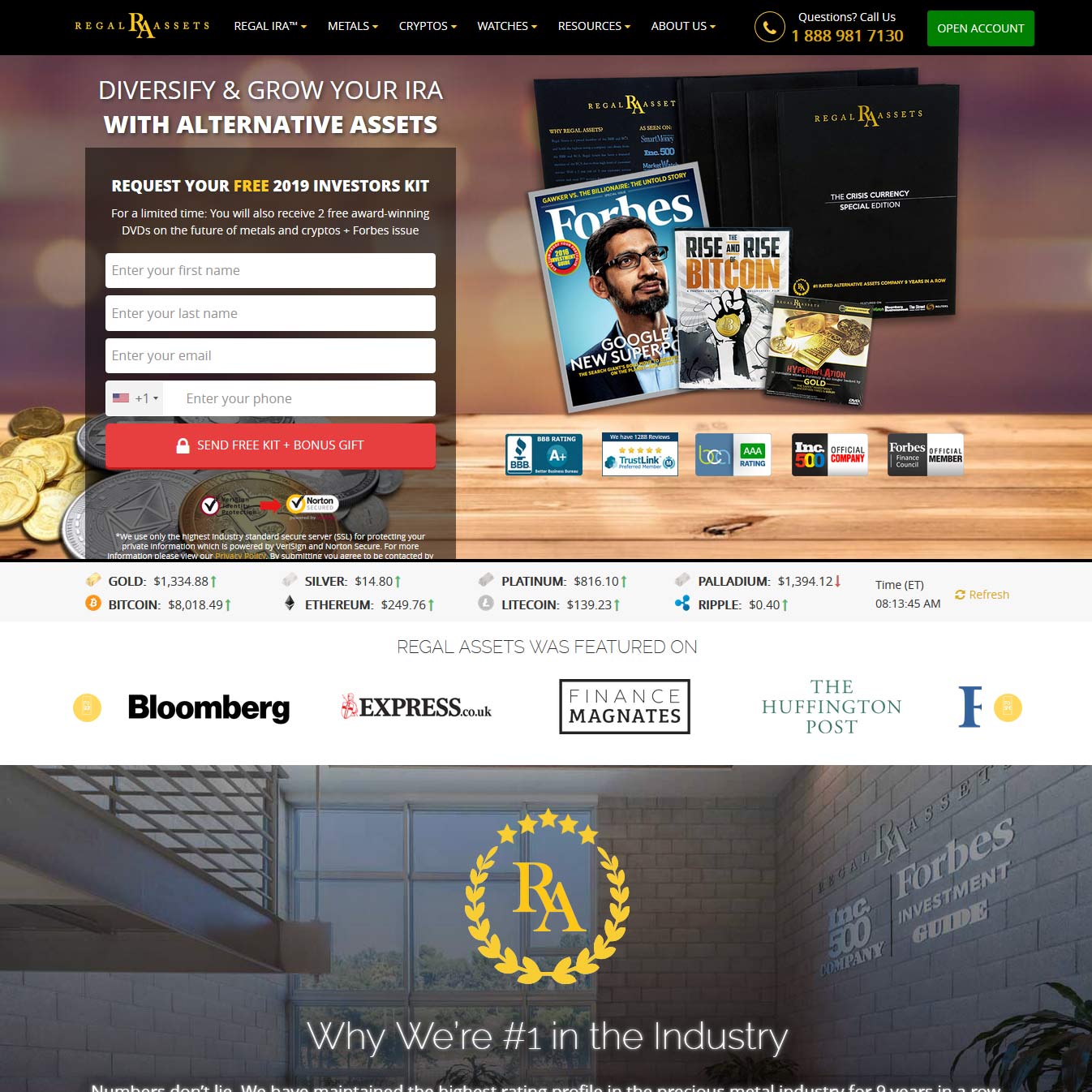 Regal Assets were voted America’s #1 Gold IRA provider for 2012, 2013 and 2014 in Consumers Choice Awards, winning the Bullion Dealer Of The Year award in 2015 and International Bullion Dealer of the Year in 2018. They are also ranked #20 out of 6 million financial service companies by Inc 500 Magazine, a ranking that’s not just looking at gold companies or IRA providers but the whole US financial services industry.