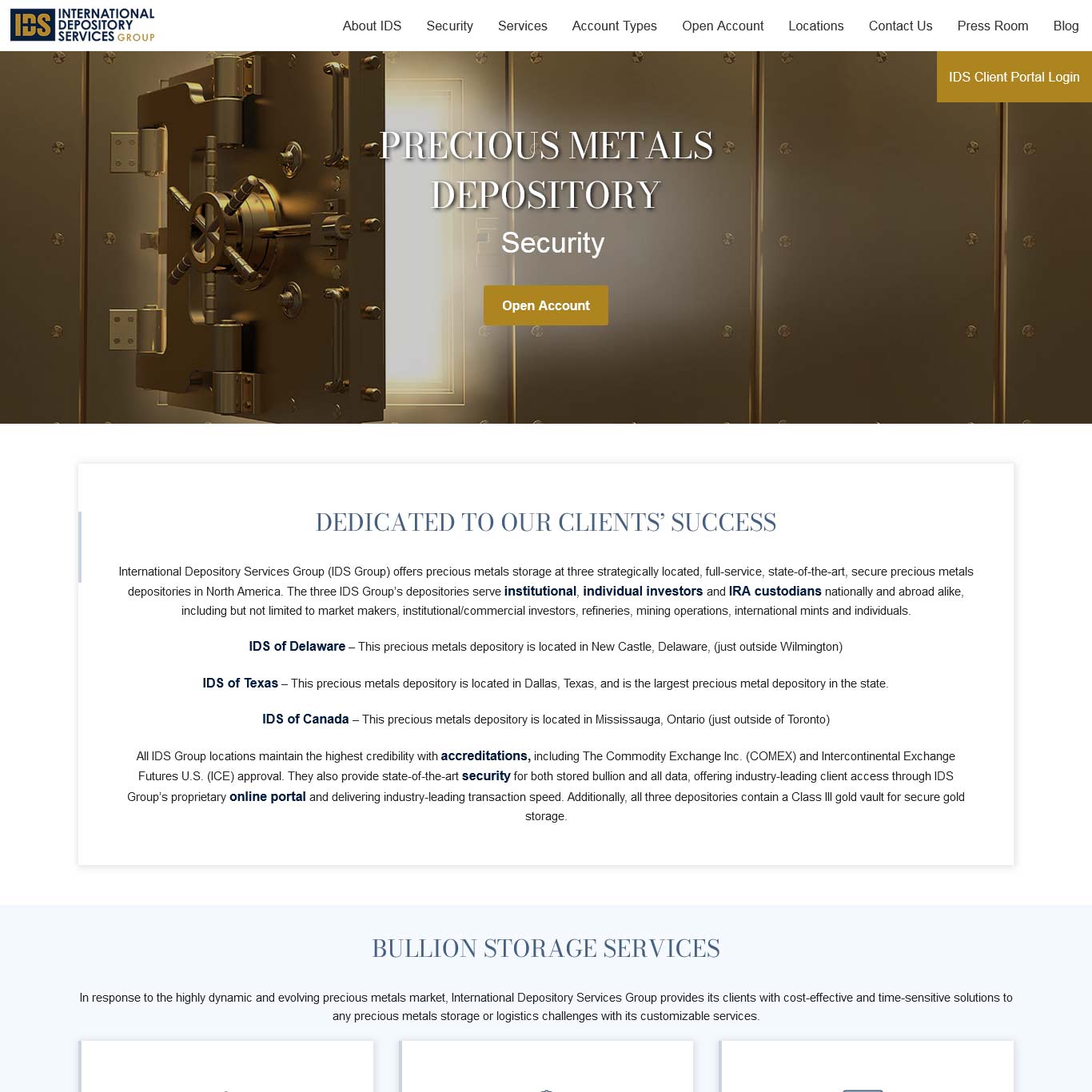 International Depository Services Group (IDS Group) offers precious metals storage at three strategically located, full-service, state-of-the-art, secure precious metals depositories in North America. The three IDS Group’s depositories serve institutional, individual investors and IRA custodians nationally and abroad alike, including but not limited to market makers, institutional/commercial investors, refineries, mining operations, international mints and individuals.