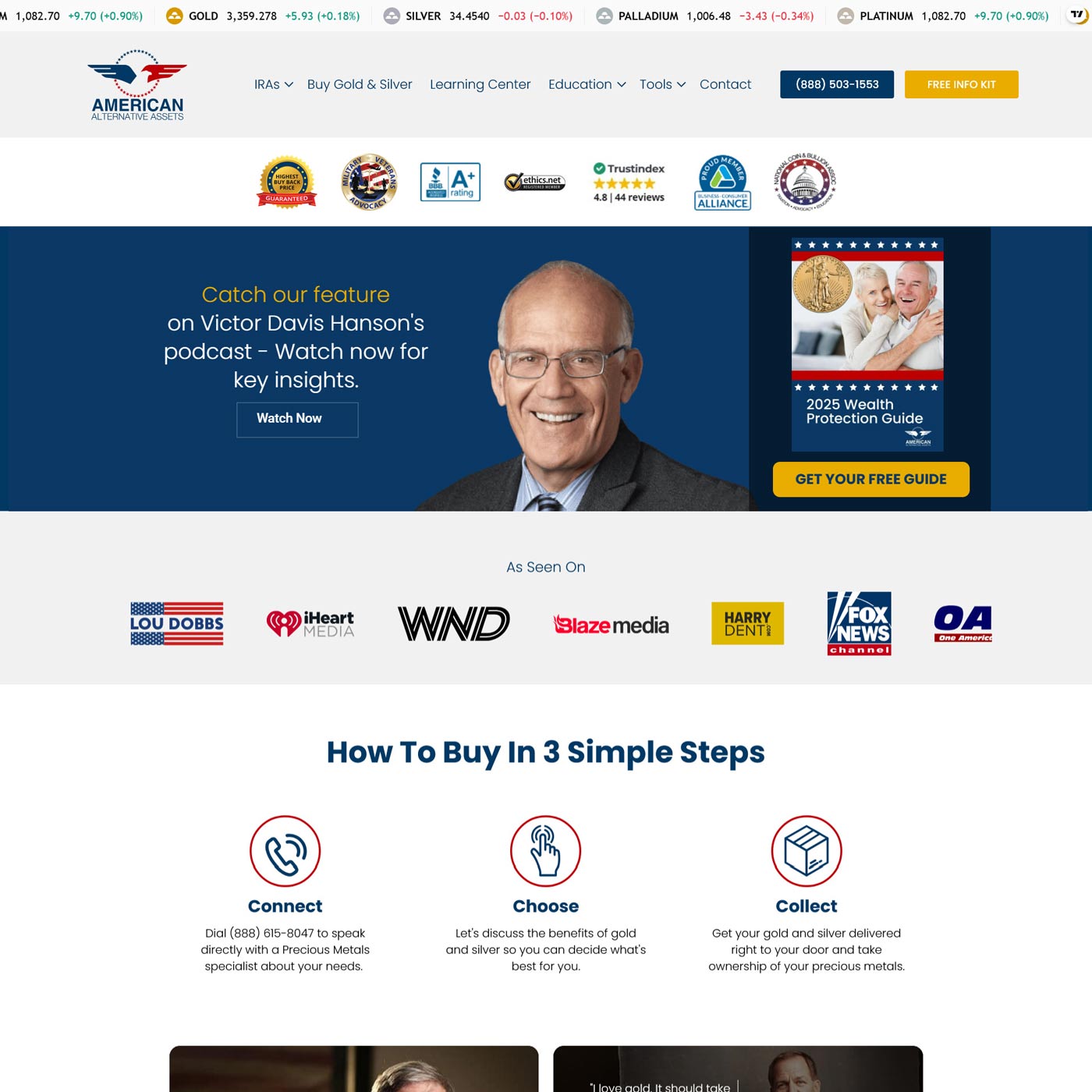 American Alternative Assets are accredited by the Better Business Bureau, hold an A+ ethics rating from the National Ethics Association, and have been featured on trusted outlets including Real America’s Voice, Just The News, and interviews with Victor Davis Hanson.