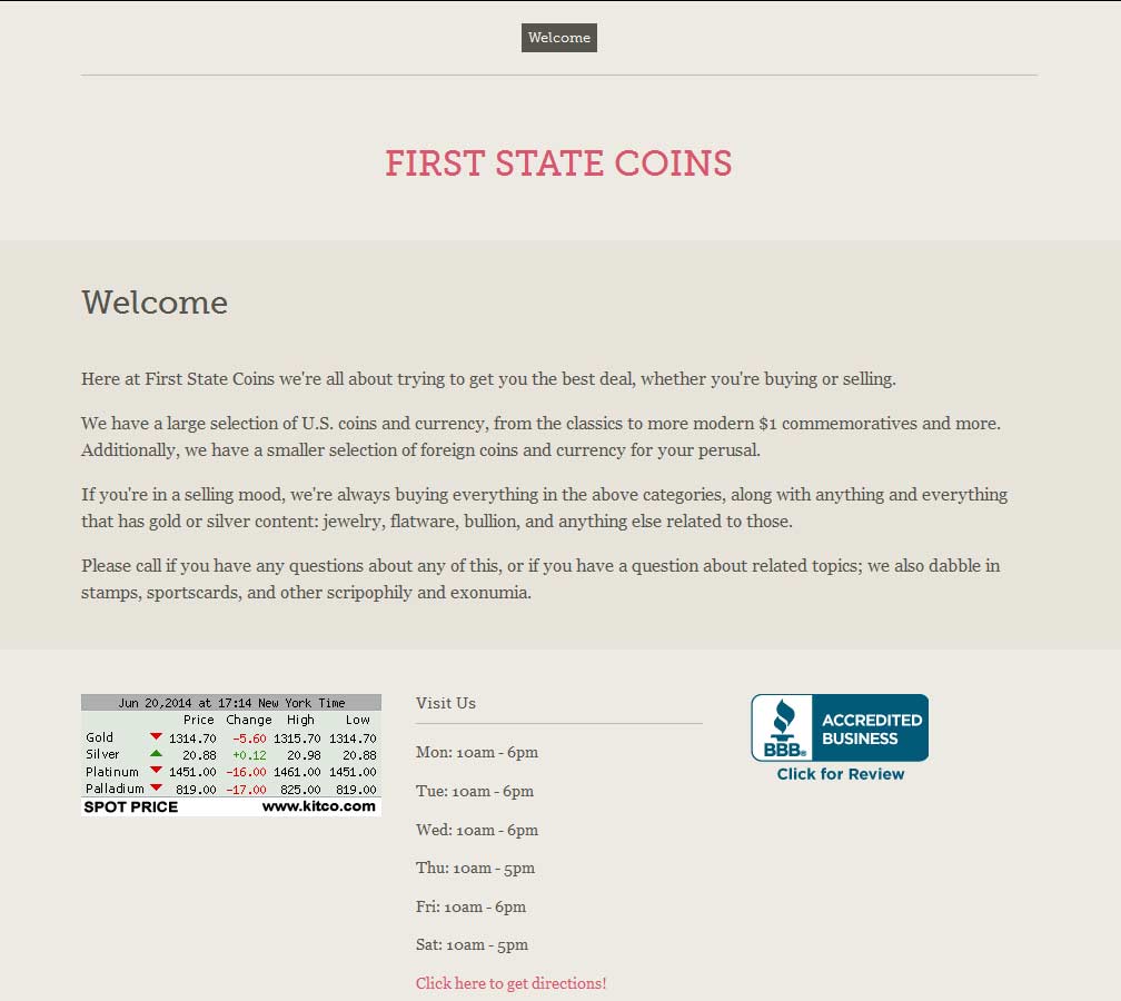 First State Coin Co. are a long established precious metals dealership specializing in coins, both numismatic and modern bullion – as well as buying scrap gold, jewelry and flatware from a retail unit in Dover, Delaware.