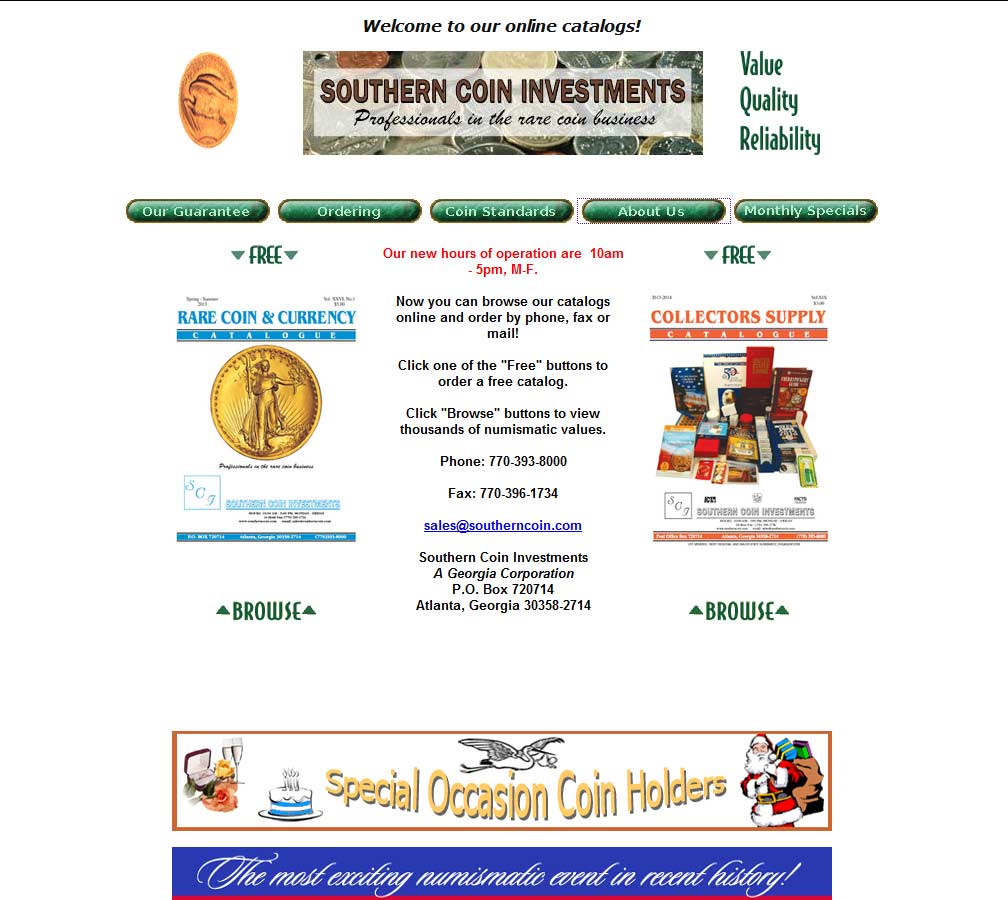 Southern Coin Investments, Inc. of Atlanta, Georgia is a large, international mail-order company. We have more than 40 years of numismatic experience and have satisfied tens of thousands of customers.