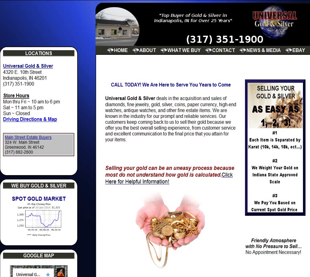 Universal Gold & Silver are precious metals dealers, buying and selling bullion bars, coins, numismatics, scrap jewelry and antiques from a retail location in Indianapolis and nationally through an eBay store.