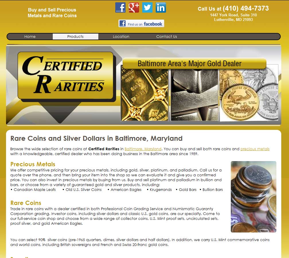Buy and sell precious metals with a reputable dealer by coming to Certified Rarities in Baltimore, Maryland. Invest in something tangible with gold, silver, or rare coins.