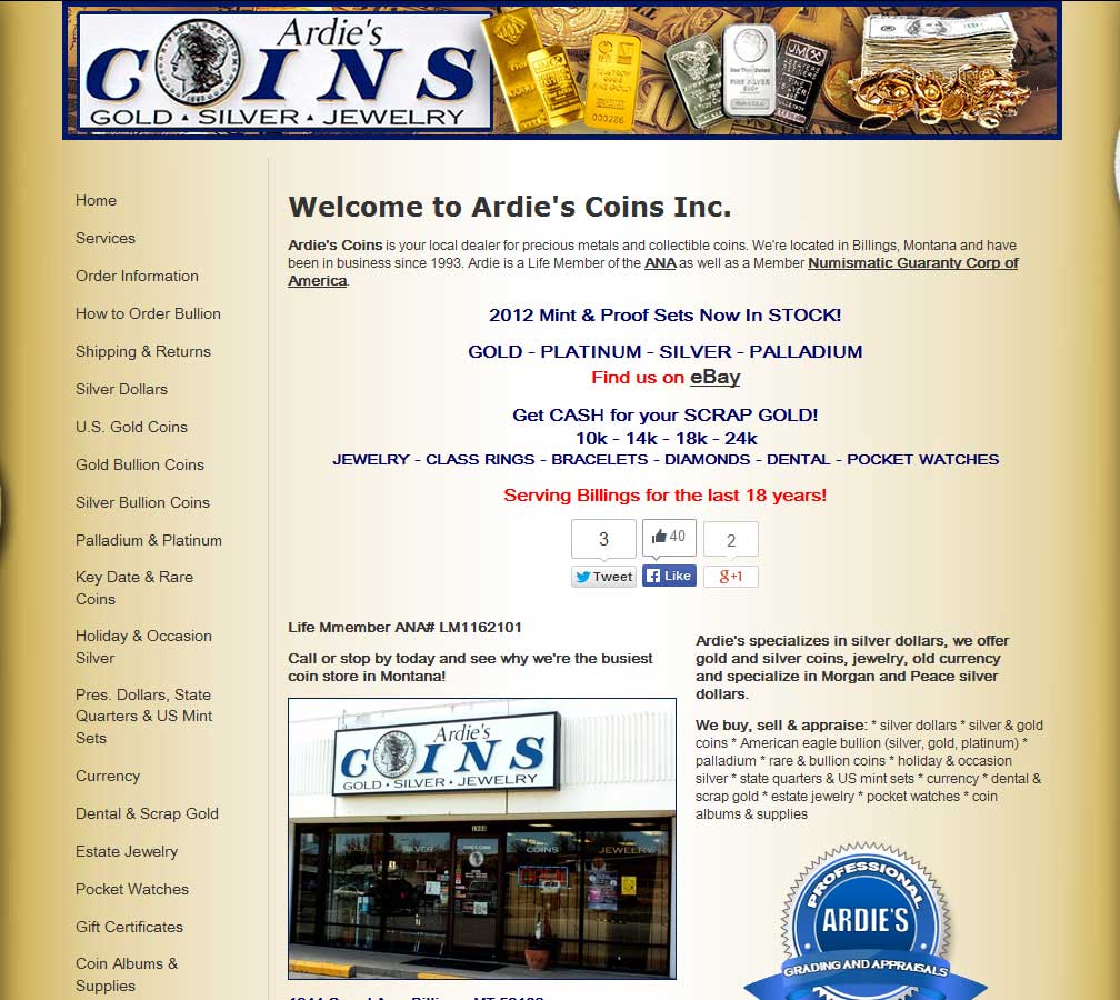 Ardie’s Coins are a well established local precious metals dealer based in Billings, Montana who specialize in bullion, numismatic, rare, collectible coins ad currency but also deal in bullion bars, scrap jewelry and flatware.