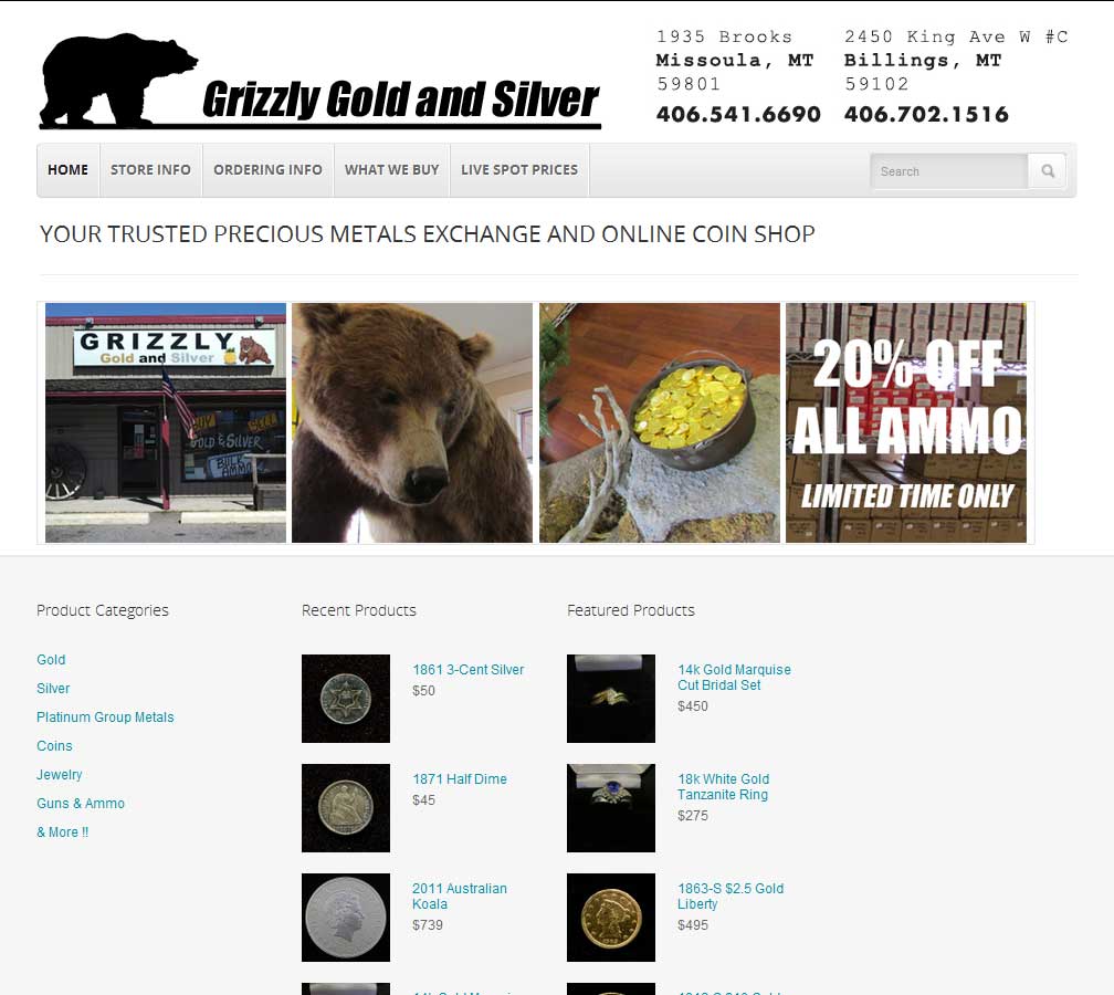 Grizzly Gold & Silver are a well established local precious metals dealer based out of two retail locations in Montana – Missoula and Billings. They buy and sell all precious metals, principally bullion bars and coins, numismatic and rare coins as well as junk silver, scrap jewelry and unwanted vintage watches.
