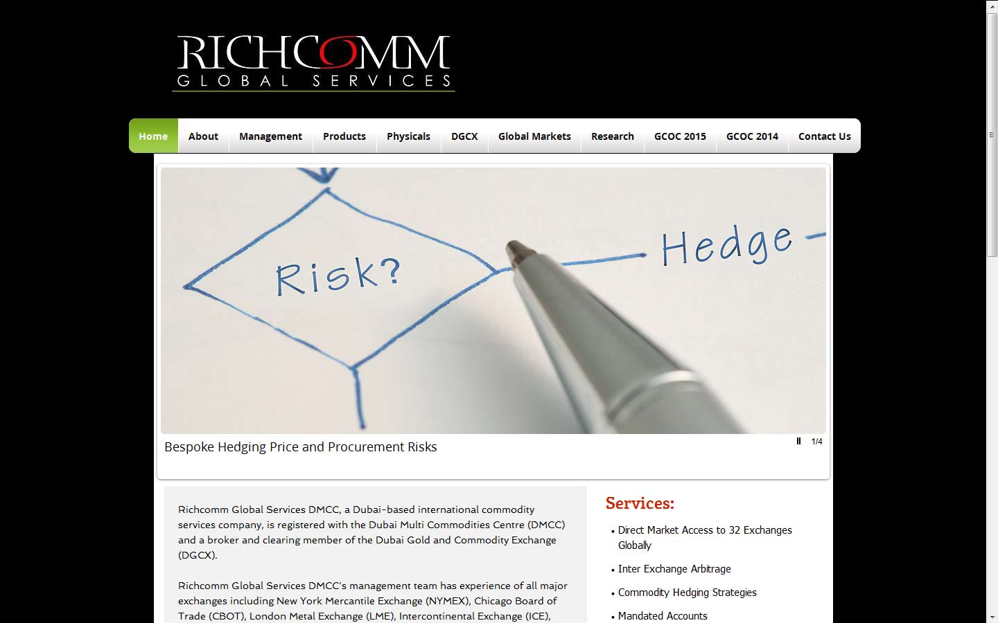 Richcomm Global Services is a Dubai-based international commodity services company, registered with the Dubai Multi Commodities Centre (DMCC) and a broker and a clearing member of the Dubai Gold and Commodity Exchange (DGCX).