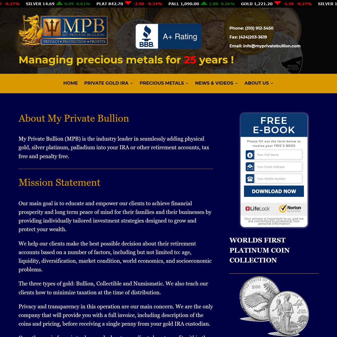 My Private Bullion are an established LA-based precious metals dealer, concentrating on the use of gold and silver inside a retirement account or as part of a balanced portfolio. With a firm emphasis on customer care and low-key selling approach, MPB are growing rapidly in a highly crowded market.